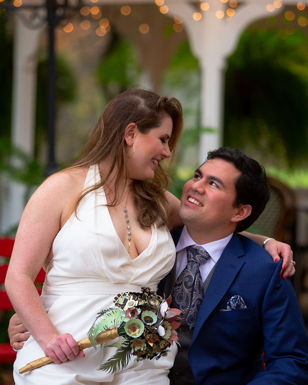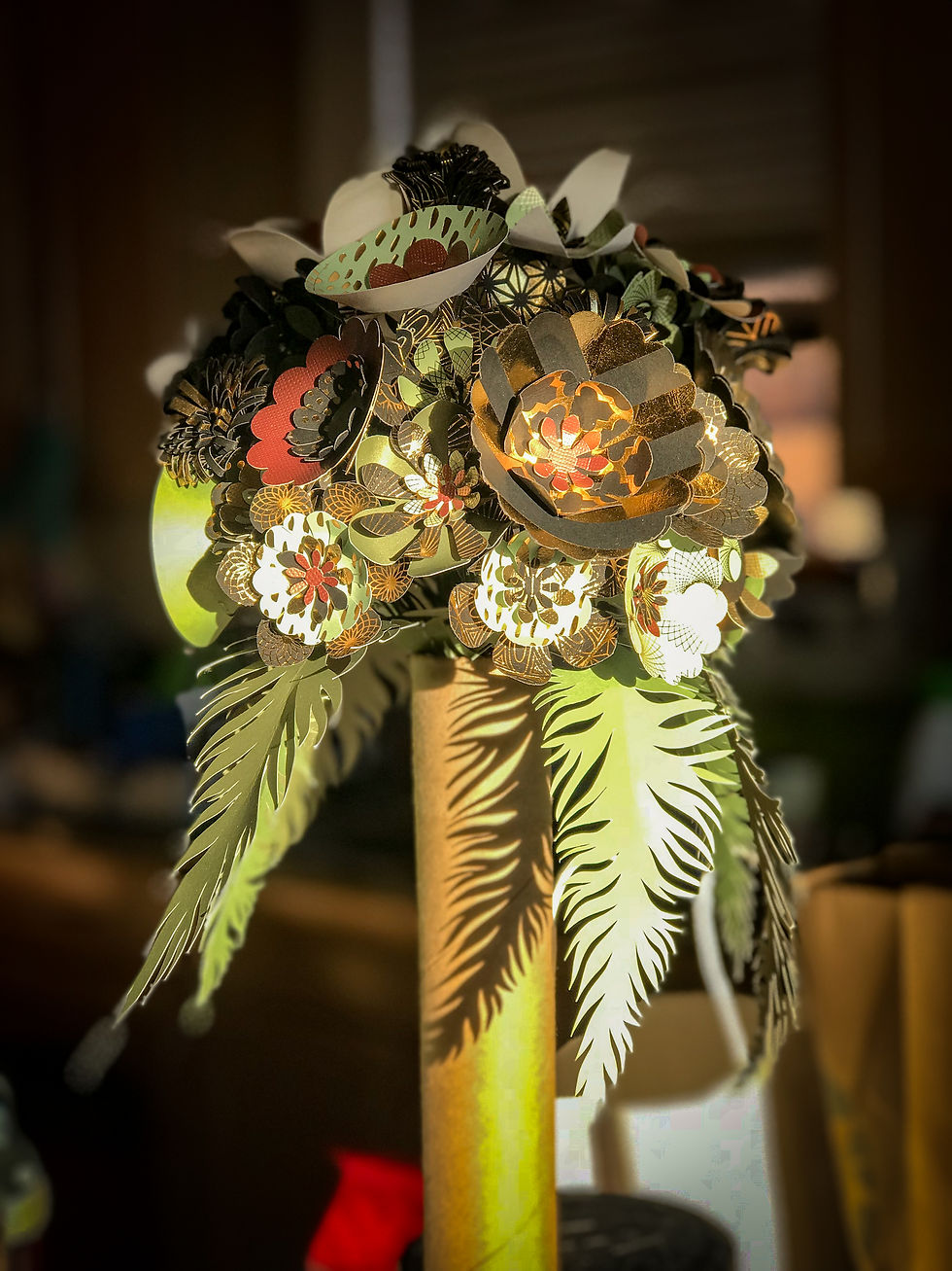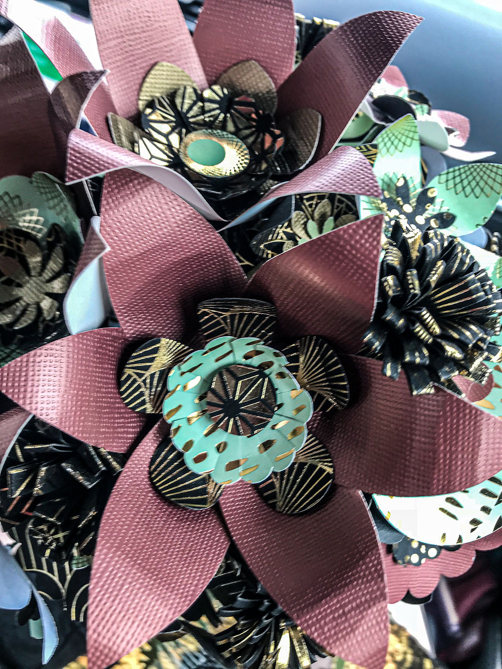 Bouquet and boutonnière constructed of cardstock, floral wire, and gold ribbon.