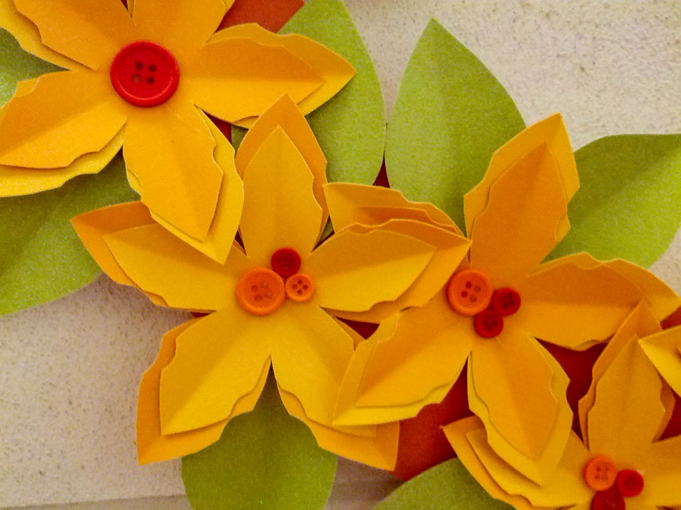 Wreaths constructed from multi-textured cardstock, buttons, and covered foam board